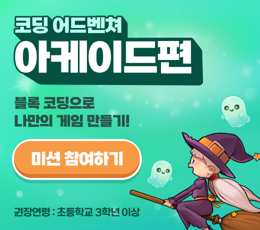 ◈ 코딩 어드벤처 아케이드편 (㈜레드브릭) - (권장연령)초등학교 3학년 이상 - (학습 프로그래밍 언어)블록코딩(OOBC) - (내용)터치로 통통 튀어 장애물 피하기(꼬마 마녀의 모험), 점프로 높이 올라 아이템 획득하기(라이트 볼을 찾아라) 등 흥미진진한 프로젝트를 통해 순차, 물리, 이벤트 개념을 응용하면서 자연스럽게 학습 - (인증서)각 스테이지 완료 시 발급(총 2회) - (사용기기/사용방법)PC / 웹브라우저 - (최적화된 이용환경) 크롬 - (최소사양) Window 7, RAM 2G 이상 - (수업지원도구) 튜토리얼 슬라이드, 튜토리얼 영상, 실습 플랫폼