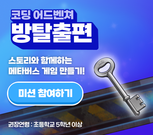 ◈ 코딩 어드벤처 방 탈출편 (㈜레드브릭) - (권장연령)초등학교 5학년 이상 - (학습 프로그래밍 언어)자바스크립트 - (내용)암호를 해독하고 보물을 찾자! <몬텐노의 금고를 열어라, 탈출을 위해 비밀 공간을 찾아라!>, <로봇 실험실을 탈출하라!> 등의 흥미진진한 프로젝트를 통해 변수, 조건문, 순차 개념을 자연스럽게 학습 - (인증서)각 스테이지 완료 시 발급(총 2회) - (사용기기/사용방법)PC / 웹브라우저 - (최적화된 이용환경) 크롬 - (최소사양) Window 7, RAM 2G 이상 - (수업지원도구) 튜토리얼 슬라이드, 튜토리얼 영상, 실습 플랫폼