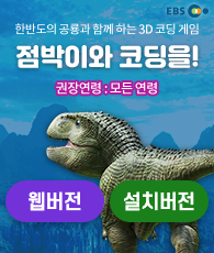 ◈ 점박이와 코딩을! (웹버전) (EBS) - (권장연령)모든 연령 - (학습 프로그래밍 언어)구글 블록리(blockly) - (내용) 산간지대, 용암지대에서 점박이의 막내와 함께 순차, 반복, 선택 개념 학습을 통해 장애물을 극복하는 코딩 모험 - (인증서)각 스테이지 완료 시 발급(총 3회) - (사용기기/사용방법)PC / 웹브라우저 - (최적화된 이용환경) 인터넷익스플로러, 크롬 - (최소사양) Window 7, RAM 3G 이상 - (수업지원도구)힌트 제공