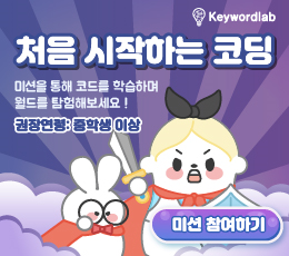 ◈ 처음 시작하는 코딩(㈜키워드랩) - (권장연령)중학생 이상 - (학습 프로그래밍 언어)파이썬 - (내용)각 미션별로 퀴즈와 학습 목표가 주어지며, 퀴즈를 해결하여 미션을 헤쳐나가는 방식으로 파이썬의 기본 이론인 변수, 자료형, 반복문, 조건문, 함수 등을 학습 - (인증서)각 단계 완료 시 발급(총 14회) - (사용기기/사용방법)PC, 태블릿, 스마트폰 / 웹브라우저 - (최적화된 이용환경)(PC) 마이크로소프트 엣지, 크롬, 사파리 / (모바일웹) 안드로이드 - (최소사양) Window 7, RAM 4G 이상 - (수업지원도구) 튜토리얼 등