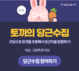 ◈ 토끼의 당근수집(㈜엘리스) - (권장연령)고등학생 이상 - (학습 프로그래밍 언어)파이썬 - (내용)다양한 경로로 토끼를 움직이고 당근을 수확하면서 효과적인 코드를 작성하기 위한 조건문, 반복문, 함수의 개념 학습 - (인증서)전체 학습 진행률 80% 이상 발급(총 1회) - (사용기기/사용방법)PC, 태블릿, 스마트폰 / 웹브라우저, 모바일 앱 다운 - (최적화된 이용환경) (PC) 크롬, 마이크로소프트 엣지, 네이버 웨일/ (모바일웹, 앱) 안드로이드, iOS - (최소사양) 인텔 코어 i3, 윈도우 7, 램 4GB 이상 - (수업지원도구)실습 플랫폼, 자동채점 기능, 실시간 헬프센터