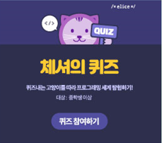◈ 체셔의 퀴즈(㈜엘리스) - (권장연령)중학생 이상 - (내용)동화 속 캐릭터 채셔 고양이가 내는 퀴즈를 풀어가며 컴퓨팅 사고력의 한 부분인 수학적 사고력, 논리력을 측정하는 문제해결 프로그램 - (인증서)전체 학습 진행률 80% 이상 발급(총 1회) - (사용기기/사용방법)PC, 태블릿, 스마트폰 / 웹브라우저, 모바일 앱 다운 - (최적화된 이용환경) (PC) 크롬, 마이크로소프트 엣지, 네이버 웨일/ (모바일웹, 앱) 안드로이드, iOS - (최소사양) 인텔 코어 i3, 윈도우 7, 램 4GB 이상 - (수업지원도구) 튜토리얼, 이론 슬라이드, 학습 플랫폼, 실시간 헬프센터