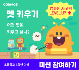 ◈ 펫 키우기 (㈜로지브라더스) - (권장연령)초등학교 3학년 이상 - (내용)자료처리, 추론, 추상화, 자동화, 일반화 5개영역 컴퓨팅 사고력 향상 미니게임을 통해 나만의 펫 키워보기 - (인증서)코딩파티 미션 완료 시 발급(총 1회) - (사용기기/사용방법)PC, 태블릿 / 웹브라우저, 모바일 앱 다운 - (최적화된 이용환경) (PC) 마이크로소프트 엣지, 크롬, 사파리 / (모바일웹) 안드로이드, iOS / (모바일앱) 안드로이드 - (최소사양) Window 7, RAM 3G, 안드로이드 OS 5.0 이상 - (수업지원도구)교사용 가이드북 및 튜토리얼