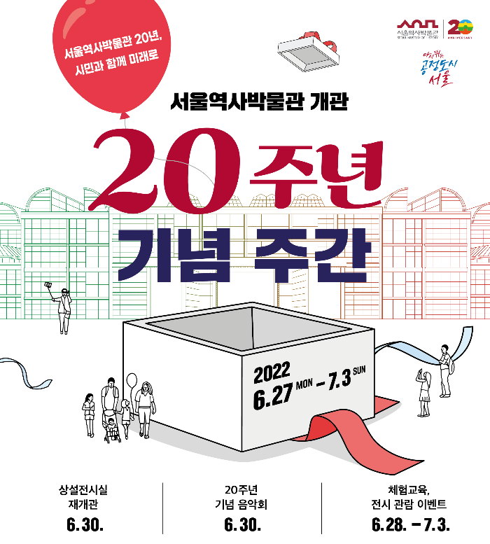 서울을 대표하는 문화공간인 서울역사박물관이 올해로 개관(2002년 5월 21일) 20주년을 기념하기 위해 오는 6월 27일(월)부터 7월 3일(일)까지 기념 주간을 열고 시민들을 위한 다채로운 행사 프로그램을 진행한다.