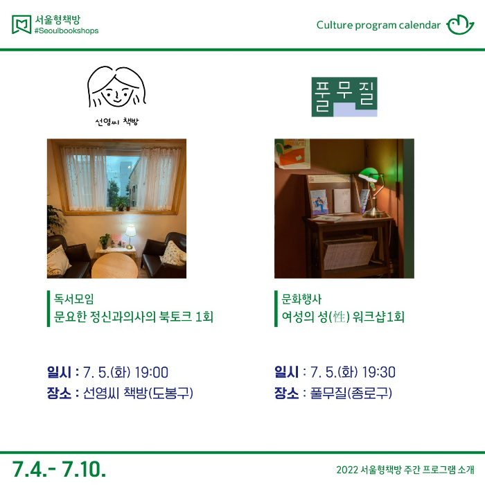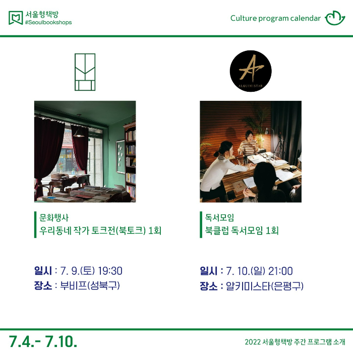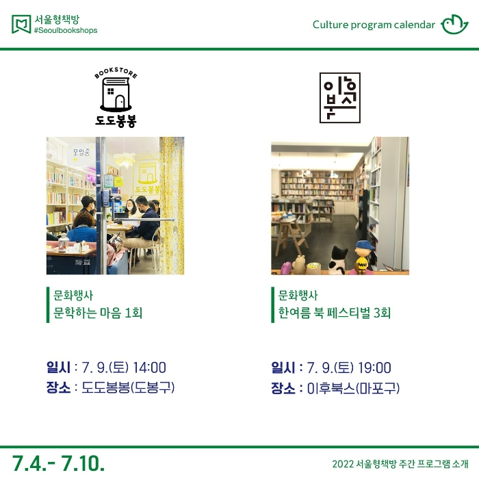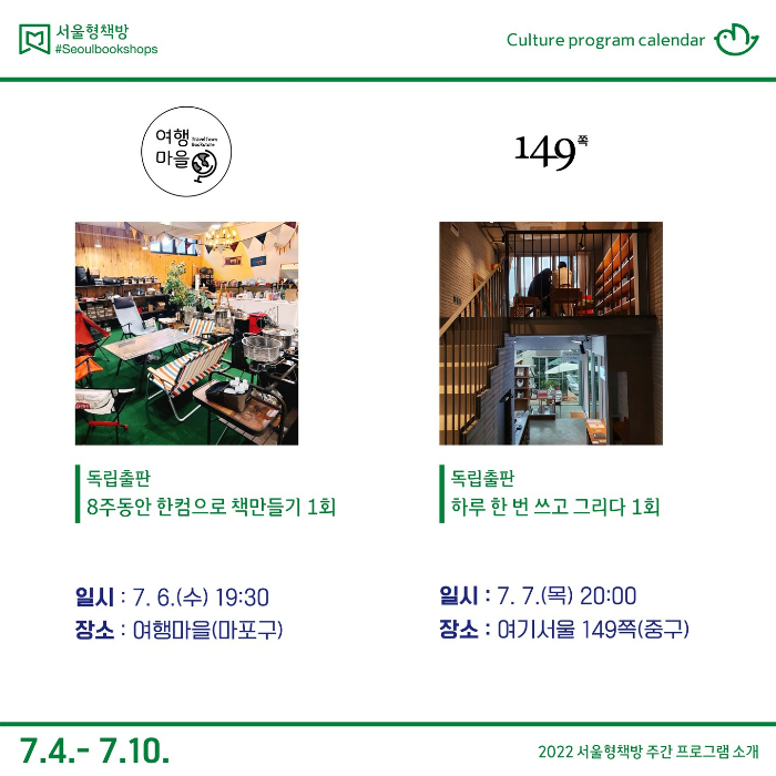 7월부터 10월까지 ‘서울형책방’으로 선정된 서점이 직접 기획한 다양한 문화행사와 독서모임, 독립출판 워크숍에 취향대로 골라 참여할 수 있다.