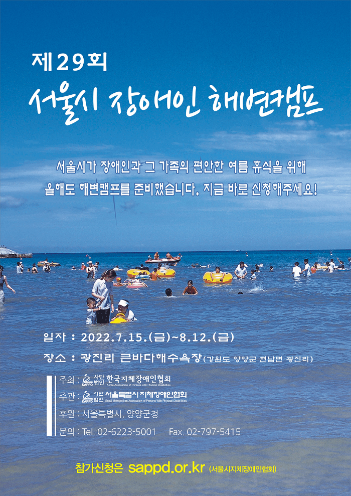 7월 15일(금)부터 8월 12일(금)까지 약 29일 간 강원도 양양군 광진리 큰바다 해수욕장에서 서울시가 장애인과 가족, 장애인 단체, 시설들의 활기찬 여름휴가를 위한 ‘서울시 장애인 해변캠프’를 개장한다.