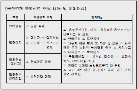 ○ 다만 음주운전‧사망사고‧무면허‧도주차량 등 중대 교통법규 위반 행위자, 과거 3년 이내 사면을 받았던 전력자는 제외